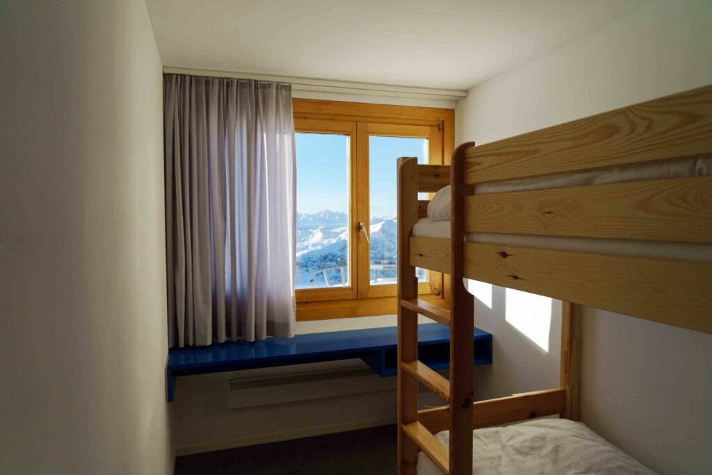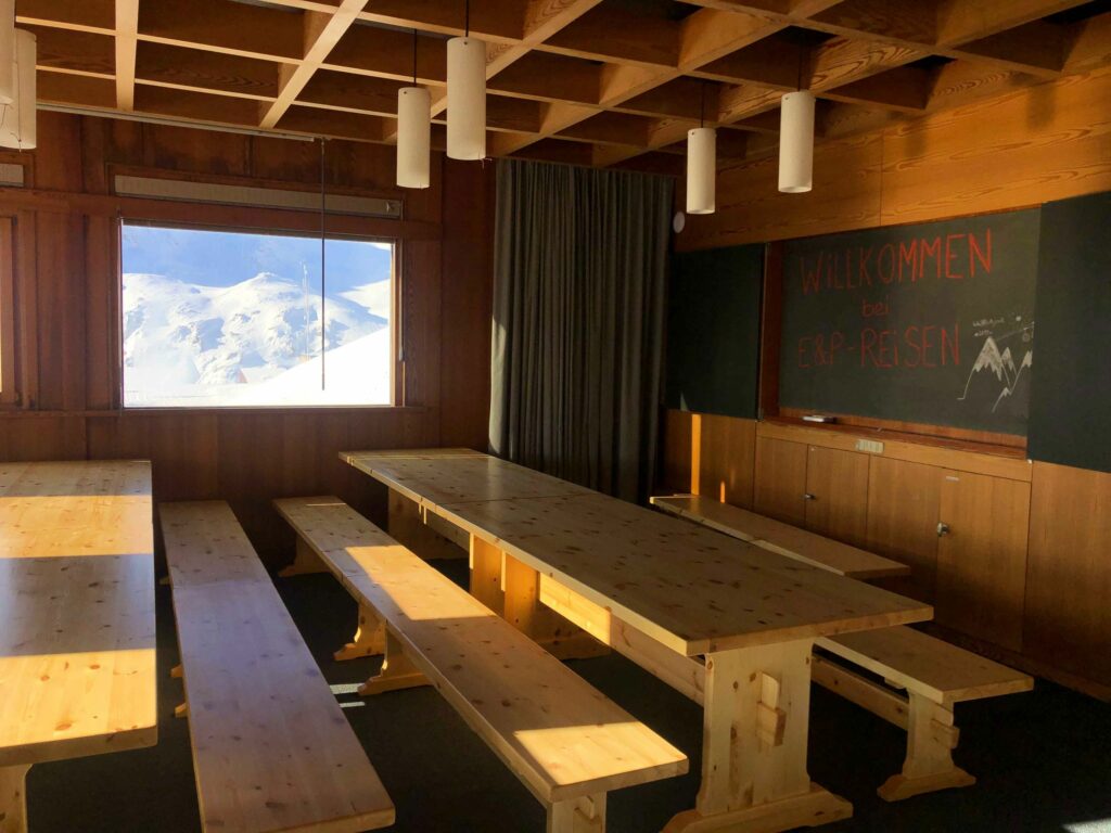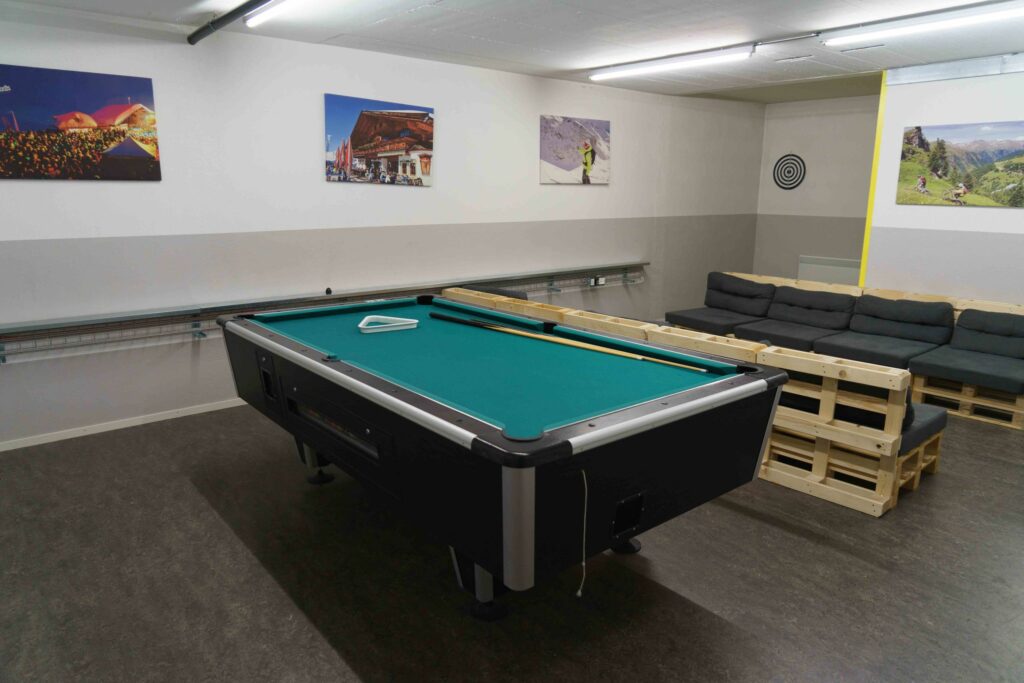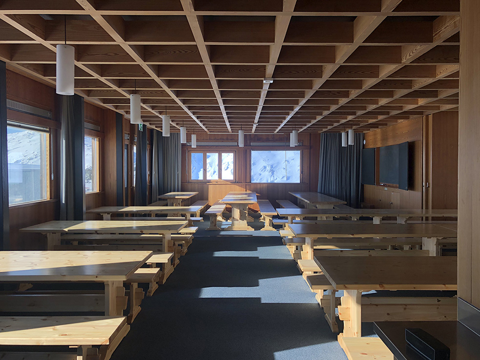 Point important pour cette édition: nous logerons directement sur les pistes au Sportclub Weissfluh, un ancien institut de recherche SLF, perché à 2’631 m d’altitude (N°3 sur le plan des pistes). Au total, l’hébergement permet d’accueillir environ 100 personnes réparties dans 25 chambres de 2, 4, 6 ou 8 lits. Il dispose d’un grand réfectoire, d’un joli séjour, de salles de jeux avec baby-foot, ping-pong et billard ainsi que d’une belle terrasse pour profiter du coucher de soleil.